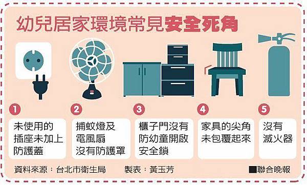 針對家中常見的五大安全死角,林莉茹建議可善用居家安全防護用品,如加裝插座防護蓋、風扇加裝防護罩、用安全鎖固定櫥櫃、尖銳家具邊緣使用防撞條或軟質材料包覆等,降低幼童割傷、夾傷或碰撞等意外。民眾若對家中安全有疑慮,也可上北市衛生局,下載居家安全環境檢核表:http://www.health.gov.tw/Default.aspx?tabid=721。
