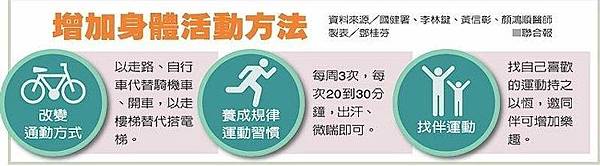 台北榮總家庭醫學部主任黃信彰表示,增加運動量方法很簡單,搭捷運或公車上下班時少坐一、兩站,徒步到目的地;企業也可為員工設計「綠色走道」,像北榮中正樓的樓梯間貼有熱量標示,提供爬幾層樓可消耗熱量資訊。部分老人有膝蓋關節問題,可游泳、快走、打太極拳。
