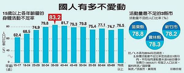 國人懶得動,身體活動量不足已成為普遍現象。衛生福利部國民健康署昨公布二○一四年「健康危害行為監測調查」,發現十五歲以上每周中等強度(微喘流汗)運動量未達一百五十分鐘的人占多數,身體活動量不足的比率達七成六,其中女性更高達八成三;相較於經濟合作暨發展組織(OECD)的其他廿九國,台灣身體活動量不足率排名第一。