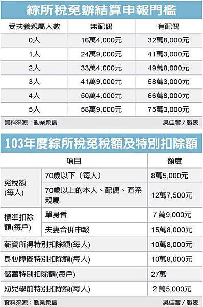 以103年度標準來看,免稅額為8萬5,000元,標準扣除額則為7萬9,000元(單身者),總計16萬4,000元。意即單身、且無扶養親屬的首報者,只要所得在16萬4,000元以下即符合免結算申報門檻。