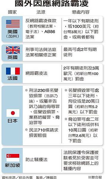 歐盟會員國法國去年通過修法,加重處罰所有霸凌,網路霸凌與一般騷擾或霸凌同罪,可處二年有期徒刑及三萬歐元(約新台幣一百萬元)罰鍰。在法國,網路霸凌通常發生在十二到十六歲的學生之間,超過半數的受害者是女性。