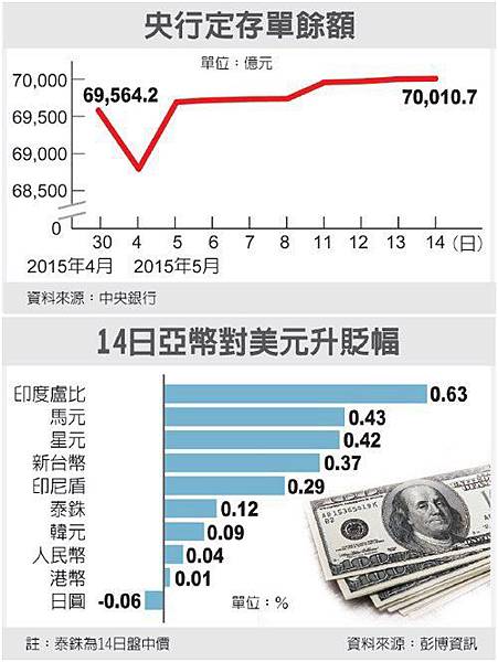 截至昨(14)日止,央行定存單餘額為7兆10.7億元,為2012年3月底以來,首度突破7兆元;央行加沖游資,使昨日金融業隔夜拆款利率微漲0.1個基本點(1個基本點等於0.01個百分點),收在0.388%。