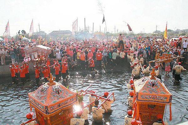 20多頂神轎衝入水深及腰的大排,逐一遶行水路、表達對客王敬意,接著神轎上岸將「客王」迎回廟裡祭拜,沿途民眾持香膜拜,許多信徒全家大小跪拜「躦轎底」,祈求神明保佑平安,隊伍綿延數公里。