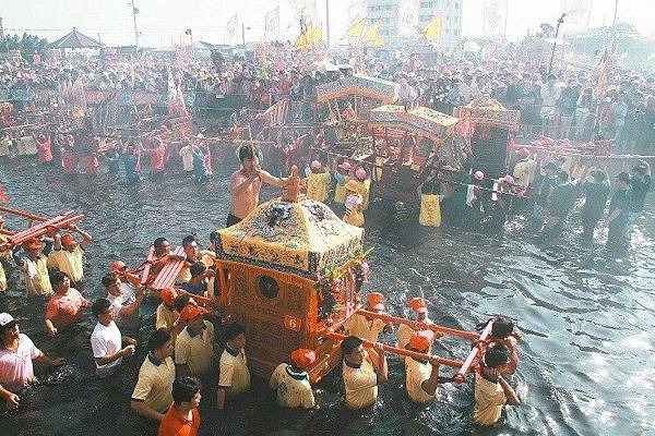 布袋迎客王 神轎衝下水