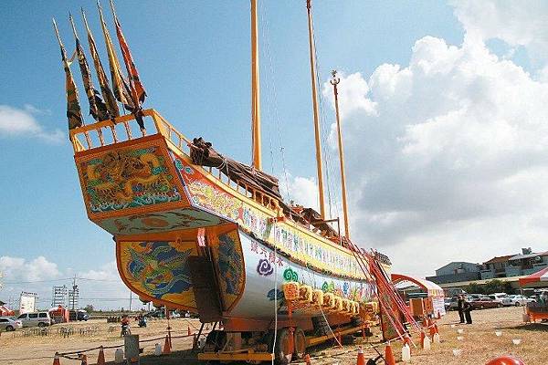 竹北南天府帝君宮將今年製作並獲金氏紀錄認證27公尺王船,在嘉應廟前展示3天。 記者卜敏正/攝影