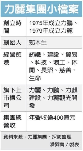 郭木生打造力麗集團,旗下有九大事業,包括紡織、建設、科技、環工、休閒、長照、慈善與生命,集團總營收逾400億元,擁有四家上市櫃公司,分別是力麗、力鵬、力麒、力麗觀光。