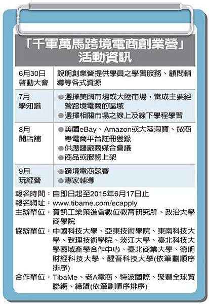 分享資訊工業策進會數位教育研究所與政治大學商學院合作,6月底將舉辦為期12周的第一屆「千軍萬馬跨境電商創業營,Youth Entrepreneur Camp--cross boarder e-commerce(YEC)」,鎖定美國、中國大陸二大電商市場,幫助具創業家精神的年輕人,在三個月內完成創業準備,快速進入電商實際經營試煉。