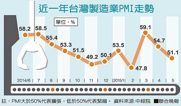 中經院今日公布台灣5月製造業採購經理人指數(PMI)為51.1%,不但連續第二個月走跌,且經季節性調整後的指數首度跌破景氣榮枯分界線50%;中經院長吳中書說,台灣景氣擴張趨緩,「這不是好現象」。