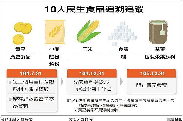另外,食藥署上周也針對黃豆、小麥、玉米、麵粉、澱粉、食鹽、糖、醬油、茶葉、包裝茶葉飲料等十大類食材製造及輸入業者,要求七月底開始落實三級品管,每三個月須自行送驗原料。