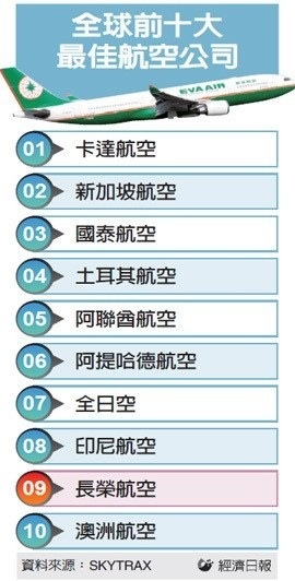 Skytrax 16日在法國巴黎國際航空展中公布「2015年全球最佳航空公司大獎」,長榮航首度擠進前十名,排名第九,再度創下國內航空公司的新高度。