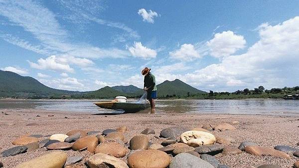泰國遭半世紀來最嚴重的乾旱,圖為雷省湄南河上游,缺水無法耕作的農民,在低水位的河邊準備捕魚。 中央社