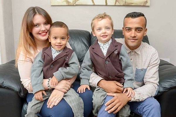 白人媽媽以及混血爸爸生下了黑白雙胞胎,醫生表示這機率是百萬分之一。圖擷自Metro都市報