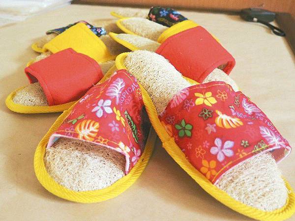 純手做絲瓜絡拖鞋 記者徐庭揚/攝影