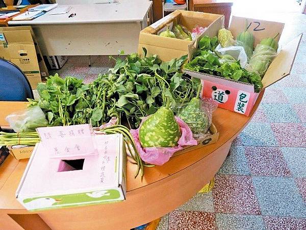 頭城鎮人文國中小校長黃友勇岳母無償提供蔬菜放置在學校服務台,沒有售價全部自由捐贈投錢。 圖/人文國中小提供