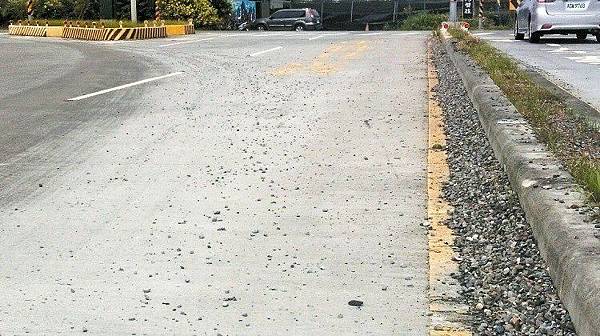 宜蘭縣頭城鎮烏一號道路砂石車出入頻繁,車輛過彎時車速快常常把碎石子撒在路面。 記者林縉明/攝影