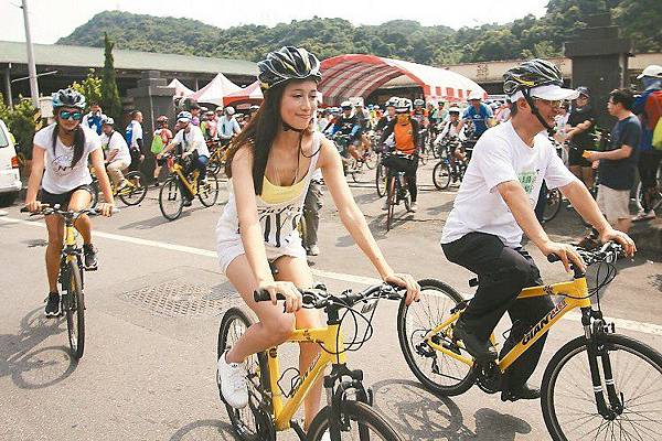基隆市政府產業發展處昨天舉辦「海漾綠活,樂在騎中」活動,熱愛單車運動的名模陳佩憶(中)任活動代言人領騎。 記者盧禮賓/攝影