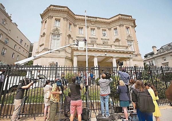 古巴駐華盛頓大使館將在廿日正式啟用,圖為工作人員上月十日在館區架設準備懸掛古巴國旗的旗桿,吸引記者搶拍。 美聯社