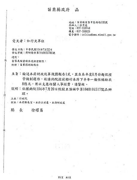 分享行政院同意預支下半年度的一般補助款新台幣8億元,挹注苗栗縣財政缺口。但政院表示,這次財政挹注只是提前撥給一般補助款項,非新增款項,未來也不會有新財源挹注,苗栗縣府須按照與政院協調的管控機制進行財務改革,否則政院仍可能緩撥或凍結統籌分配稅款與一般補助款。
