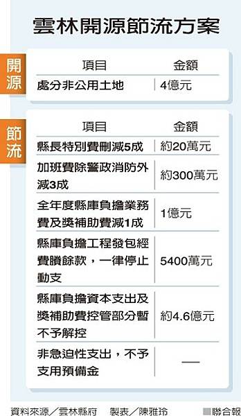 縣府也提出減債計畫,設置公共債務管理委員會,加強債限管控、降低債務餘額,並建立債務預警、考評及揭露機制,每年至少強制還本三點五億元,讓雲林財政狀況恢復健全。
