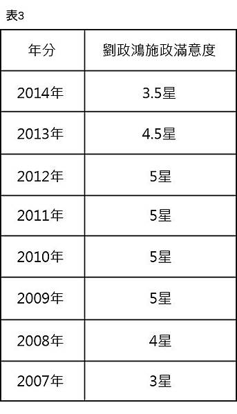 而且劉政鴻在《遠見雜誌》多年的調查中,成績起伏,部分名嘴卻只強調他是5星縣長,卻為什麼不說他也曾是《遠見雜誌》3星、3.5星、4星、4.5星縣長呢?是否以偏概全,刻意扭曲視聽?(表3)