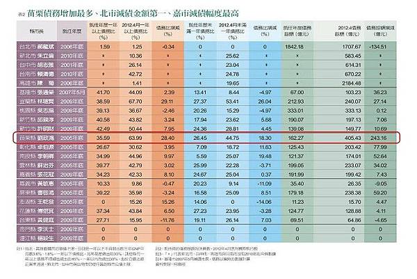 其實《遠見雜誌》早在2012年7月出版的雜誌中,就特別針對22縣市債務進行總體檢,當時調查結果顯示,苗栗縣不僅是全國人均負債第二高(7萬2016元)的縣市(僅次於高雄市7萬8713元)(表1)。同時也是債務增加最多的縣市,從就任時(2005年底)的162.27億元,增加至2012年4月的405.43億元,增加金額為243.16億元(表2)。