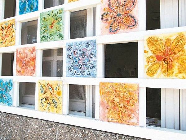埤子村阿嬤們,與藝術家一起完成小型浮雕,裝飾在活動中心外窗(圖)。 記者謝恩得/攝影