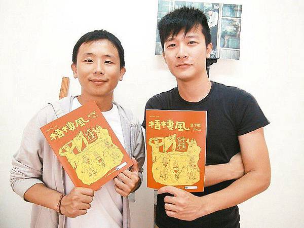 來自台南的李至孝(左)愛上梧棲小鎮,與當地青年吳念恩共同製作刊物「梧棲風」,期盼讓更多人認識梧棲之美。 記者余采瀅/攝影