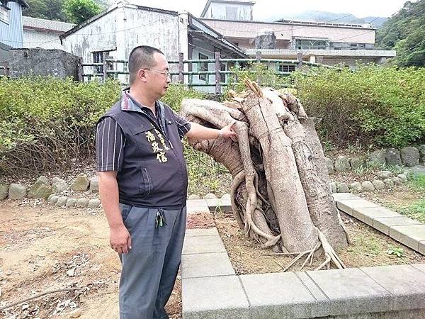 弓橋里長潘政信說,這次蘇迪勒颱風來襲,弓橋里地理位置屬河谷地形,所以風雨會特別強烈,尤其這棵榕樹的位置正好處於風切處,所以高大的樹木應聲斷裂,只剩下一截樹幹,根部則是還在。