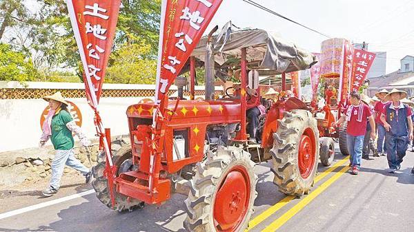 民雄鄉雙福社區居民請出近300年土地公,以鮮紅鐵牛車遶村插「土地公拐」。 記者呂慧瑜/攝影