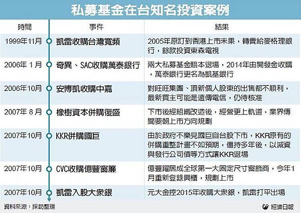 私募基金在2008年金融海嘯之前,一度對台灣非常有興趣。但私募基金的操作,多是希望取得公司的主導權,有時候還會規劃上市公司先下市,重整體質後重新上市或出售,並且大多數是「出資1元、槓桿借款3元以上」的財務操作模式,讓台灣的財經界與政府決策圈很不諒解。