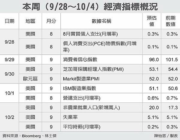 本周數據重頭戲,仍在美國的就業及消費數據,目前預估9月非農業就業人口增加20萬人,優於上月的17.3萬人,失業率維持5.1%的低點,平均時薪月增率可望維持較上月成長0.2%,就業表現仍屬穩健。消費方面,公布8月實質個人支出及個人消費支出(PCE)物價指數,可望較7月維持正成長,但受到美股近期表現疲弱的影響,9月美國經濟諮商會消費者信心指數預估僅96.0,不如8月的101.5,製造業方面8月ISM製造業指數50.6創下兩年三個月以來的新低,9月可望略回穩到51.1的水準。