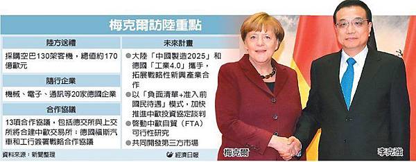 中德總理會談後,李克強表示,將推動「中國製造2025」和德國「工業4.0」攜手,合力拓展戰略性新興產業合作;並以「負面清單+准入前國民待遇」的模式,加快推進中歐投資協定談判,同時,盡早啟動中歐自貿(FTA)可行性研究。