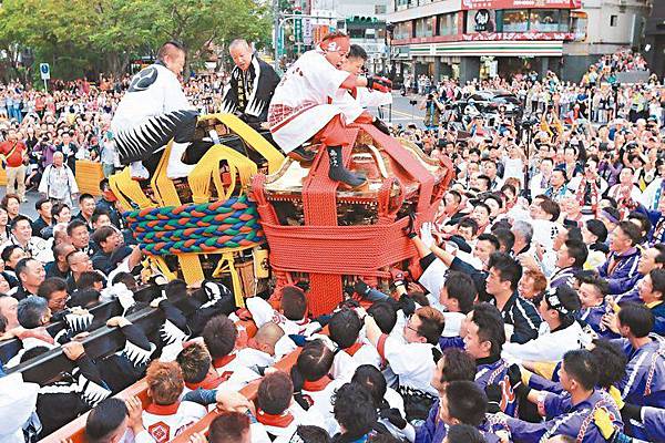 「台北溫泉季」在捷運新北投站周邊舉行,昨天來自日本愛媛縣松山市派出4頂神轎前來表演撞轎祈福儀式。4頂神轎各約6、7百公斤,每頂轎子都由百人抬轎,撞轎時互不相讓,用最熱鬧的撞轎祈福儀式,炒熱溫泉季氣氛。
