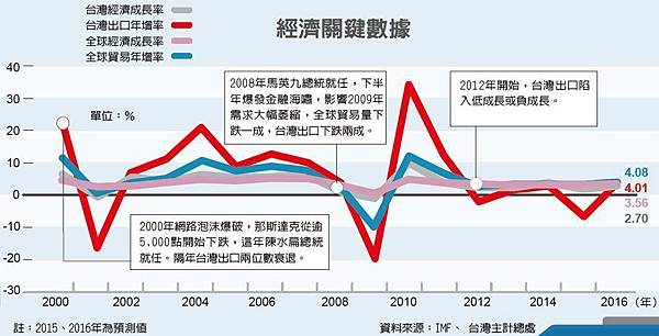 金融海嘯發生在2008年,就以海嘯前2004年、海嘯後的2013年為例,比較其變化。根據國際貨幣基金(IMF)資料,2004年全球經濟成長5.19%,全球貿易成長幾近兩倍,達11.02%,貿易是商品出口和進口;同一年台灣出口成長21.10%,又幾近是全球貿易成長的兩倍,經濟成長6.51%,高於全球經濟成長。
