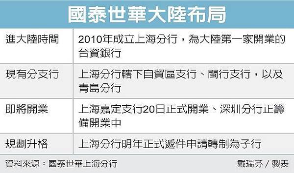 國泰世華銀上海分行明年申請轉為子行。 本報系資料庫
