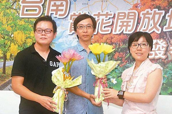 觀光旅遊局長王時思(右)昨邀攝影師黃國棟(中)及張銘方當護花使者,一起建構台南賞花地圖。 記者邵心杰/攝影