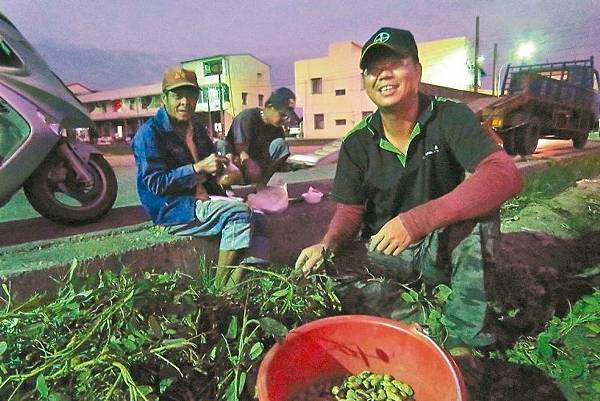 正值北港花生採收期,農民吳亞霖(左)及吳宗儒(中)父子與堂弟吳江河(右)協力收成落花生,傍晚時分,大家在田埂上吃晚餐。 記者胡瑋芳/攝影