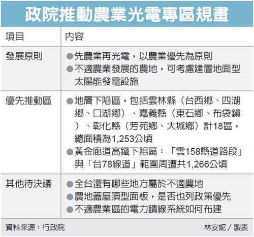 至於還有哪些地方屬於可種電的不適農地,因部會間未形成共識,加上又有環保團體緊盯,毛揆未做拍板,要求國發會再邀部會討論。