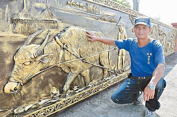 林文斌是後龍鎮前鎮長鄭家定妹婿,從事寺廟建築設計30年,專攻「泥塑」工藝,擅長「雕龍塑鳳」,是少數能一手包辦構圖、施作的工匠,在外闖蕩數十年,今年終於一償宿願,在社區創作首面水泥立體雕塑。