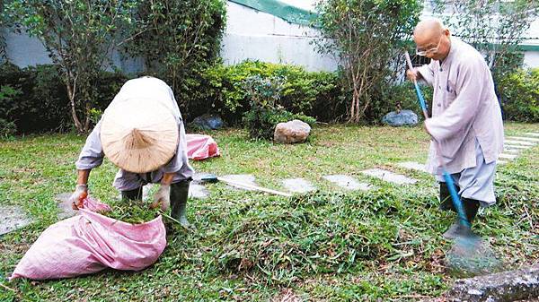 傳開法師(右)長期打掃社區公園,駝背的開鎮法師(左)歡喜參與。 記者謝龍田/攝影