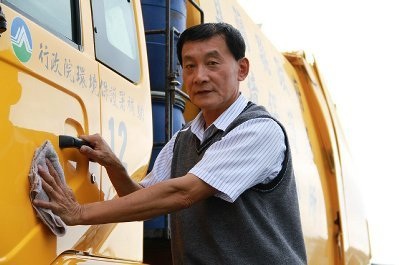 「垃圾車就是自己的車,要好好對待。」郭榮新為垃圾車打蠟,平常維護不馬虎,有些掉漆就補上,打蠟除了亮麗,因垃圾車常會收到一些含酸鹼的垃圾,上了蠟,多了保護。
