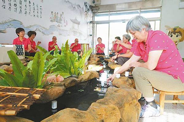 鹿谷鄉農會以「曲水流觴」為發想,「以茶代酒」模擬前人在山水間吟詩作對的情境。 記者賴香珊/攝影