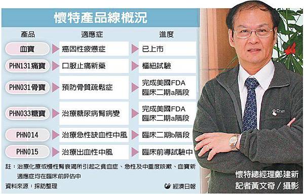 第三是授權、擴大國際接軌,鄭建新說,懷特旗下除了已經上市的血寶,還有正在臨床試驗中的痛寶(樞紐試驗)、骨寶(二期)、糖寶(二期)等,血寶也正進行新適應症,如缺血性、出血性中風等的臨床試驗,前個適應症僅收86名病患,明年解盲後可望申請藥證。