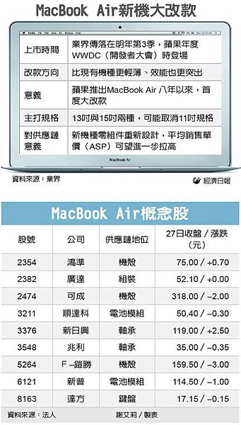 現有MacBook Air供應鏈包含組裝廠廣達、電池模組廠新普、順達科,機殼廠可成、F-鎧勝,樞紐廠新日興、兆利,鍵盤廠精元、達方、群光,散熱模組廠雙鴻等。據了解,蘋果明年新改款MacBook Air,仍將延續現有的供應鏈。