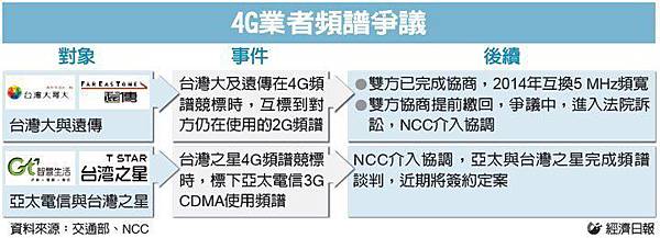 2013年台灣第一次釋出4G頻譜,總標金衝上1,186.5億元的天價,但因競標前未清出頻譜,衍生業者頻譜爭議,國家通訊傳播委員會(NCC)主委石世豪為此找來各電信董總座協商,亞太與台灣之星首樁頻譜協商可望近期達陣,最給面子;遠傳與台灣大則是還在談。