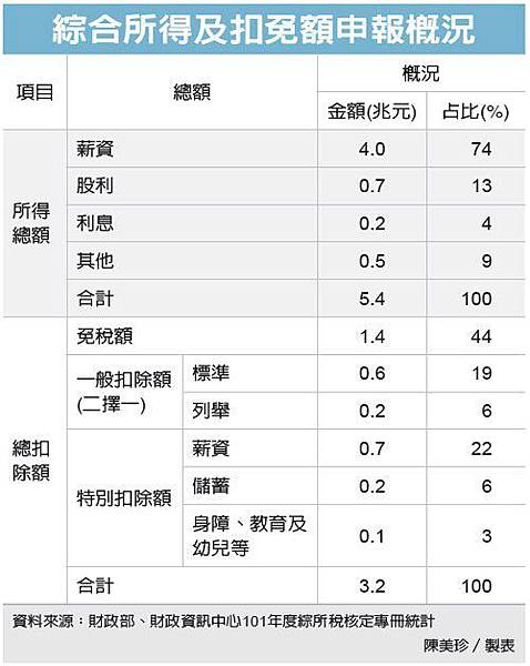 依據財政資訊中心資料,財政部以101年度統計為例,全台申報的綜合所得總額是5.4兆元,扣除總扣除額3.2兆元後,用以課稅的稅基(所得淨額)剩下約2兆元,約近600萬個報稅家庭,共計繳出的所得稅是3,094億元,平均有效稅率只有5.7%。總金額高達3.2兆元的扣、免額,以高所得家庭受惠較大。