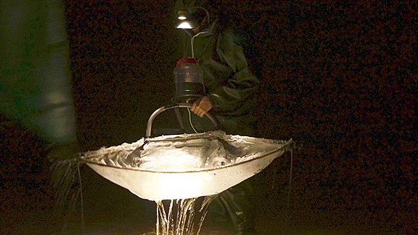 他說,撈鰻苗可不是拿網子在海中瞎攪,是趁浪打上岸後,網子立即放入海中「碰運氣」,一起網用燈光照射,如果網底有亮亮的東西在動,就有可能是鰻苗,先用手挑進綁在脖子上的桶內,回去再慢慢檢查是否是高價值的全透明「白鰻苗」。