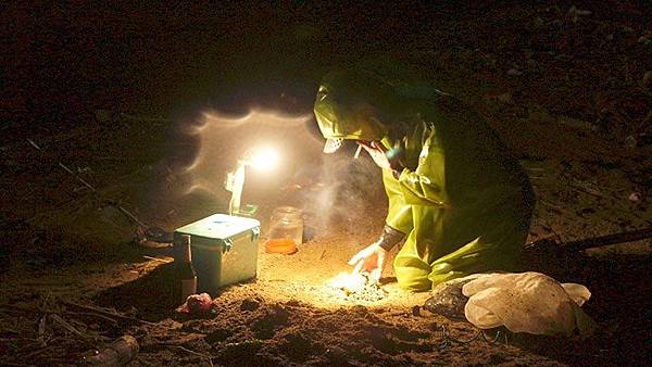 黑矇矇海面,頭燈探照如耀眼珍珠。
