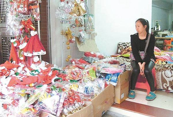 賣彩帶和小玩具的陳姓老闆娘說,一年內就是靠著幾個節慶衝業績,現在連最後一個耶誕節慶都如此冷清,一個月前批的貨,到耶誕前夕還剩下一半庫存。跟去年相比,業績下滑超過一半,也不敢請臨時工,叫家裡的孩子來幫忙。她說,商品都是到浙江、義烏等地批發過來。