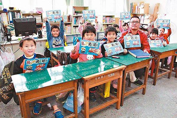 消防繪本的設計人第二大隊隊員劉初英(前右三),將繪本贈送給芎林國小的學童。 記者林麒瑋╱攝影